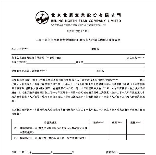 详情点击:二零一六年年度股東大會適用之H股持有人之補充代理人委任表格(H)