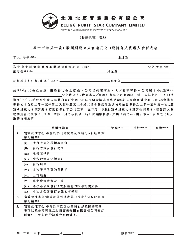 详情点击:二零一五年第一次H股類別股東大會適用之H股持有人代理人委任表格(H)