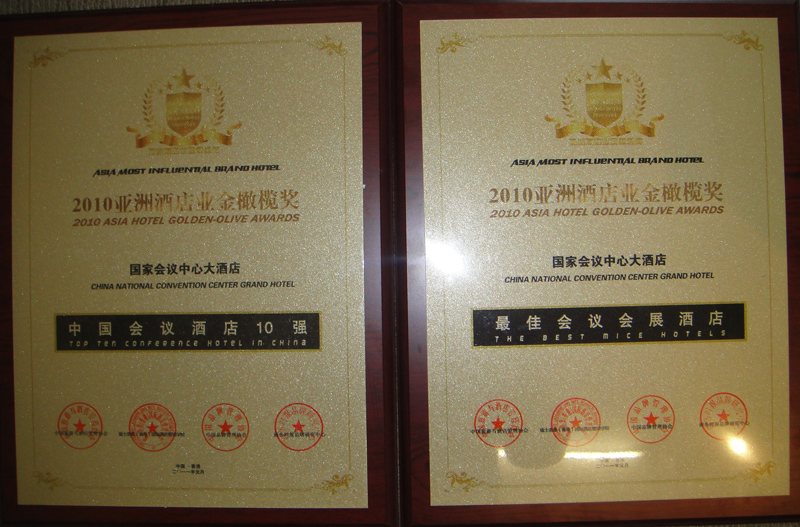 1月10日-12日,国家会议中心参加了在香港举办的第四届亚洲酒店业领袖峰会暨2010亚洲酒店业金橄榄奖颁奖盛典。在颁奖典礼上,国家会议中心大酒店荣获了“2010年亚洲酒店业金橄榄奖暨中国会议酒店10强”和“2010年亚洲酒店业金橄榄奖暨最佳会议会展酒店”两项大奖。