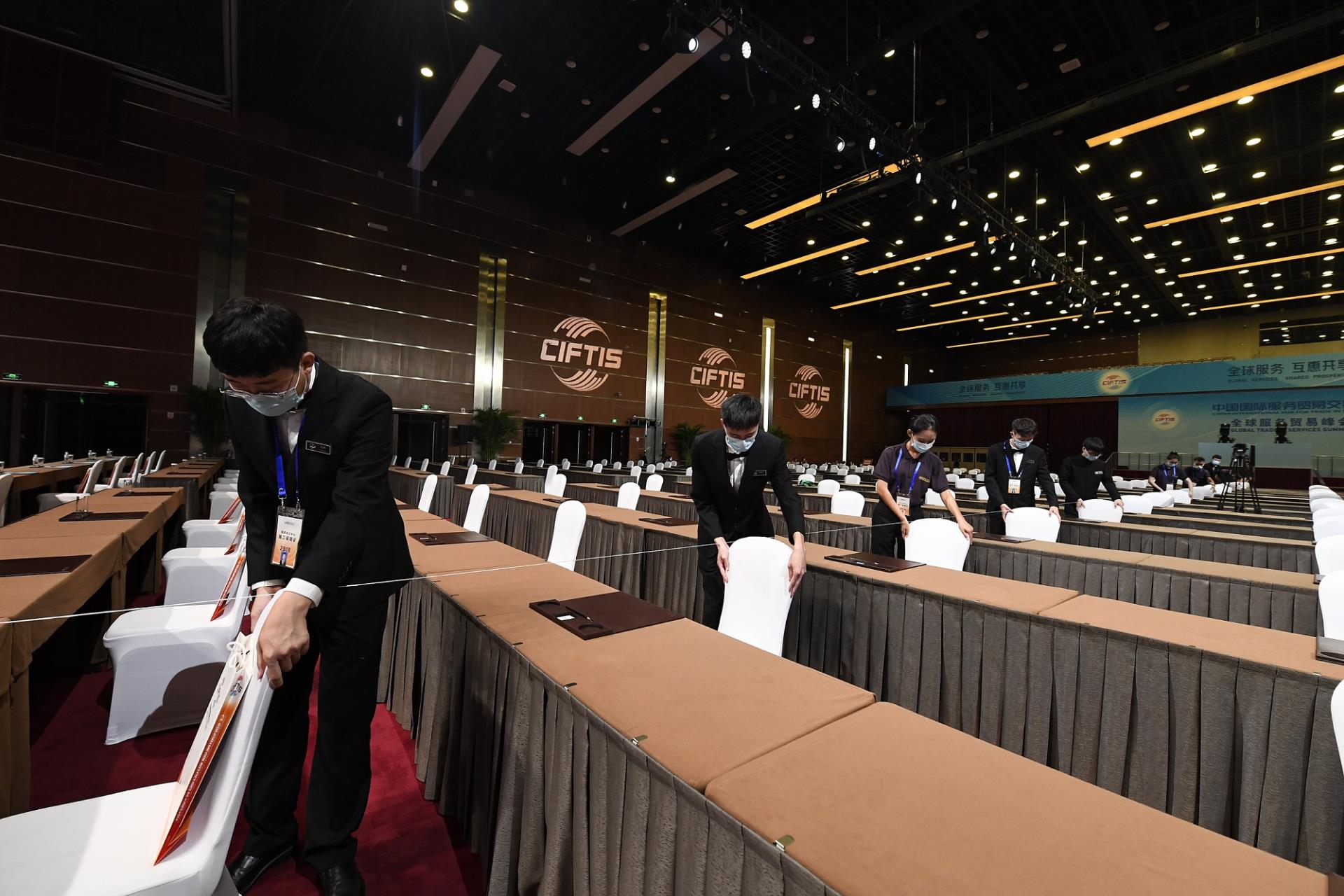 据统计,国家会议中心为服贸会提供了130余场线下会议活动服务保障。期间,服务人员共翻台422次,单天最高108次。在会场内,横平竖直的桌椅摆台均按防疫要求摆放,保证会前、会中、会后通风30分钟,服务人员为客人提供安全、温馨的服务。
