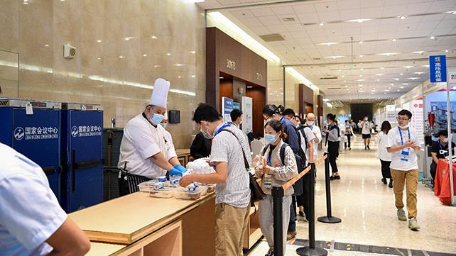“经典”有序的背后是精细的对接和精心的服务。该大会早在2019年签约,随着2年间的疫情暴发和反弹,特别是今年8月的会展活动暂停,对于9月份的展会活动恢复有着最为直接的影响。在此期间,企业销售人员不断与主办联络,关注会议启动、注册人数、会场规划调整、穿越服贸期间的报批,各部室通力配合一个个环节串联,稳步推进活动举办。临近大会开幕,多地疫情再次有反弹现象,销售人员主动协助主办,当即启动疫情防控应急方案把控大会人员健康情况避免风险。为避免人群聚集且提高就餐效率,国家会议中心会期内采取增加取餐、茶歇的服务点位、5000平米大会场多次会餐转换翻台,近20000人次用餐、7000人次的茶歇服务高效安全进行,确保参会人员的防疫安全和大会的顺利举办。