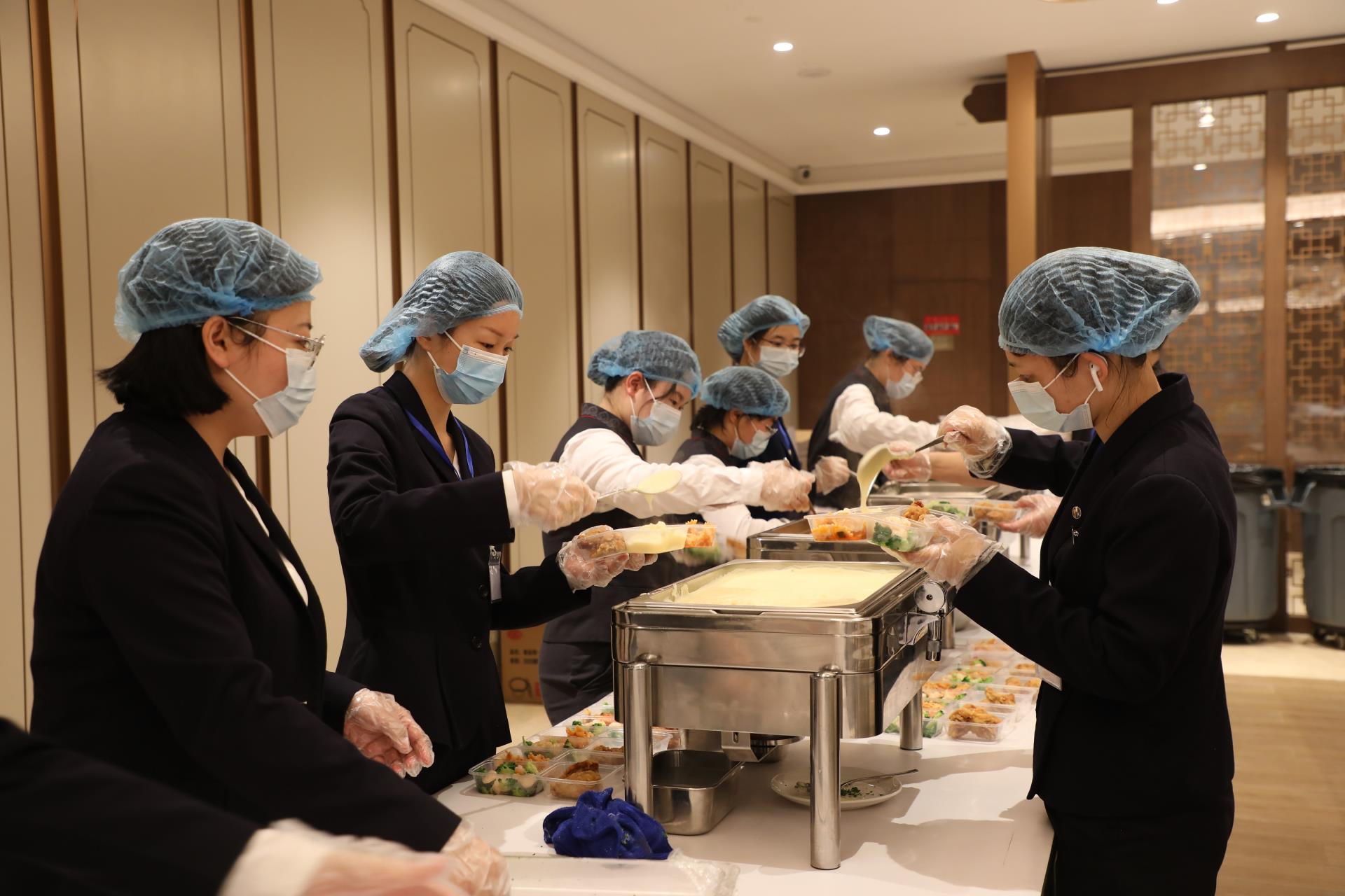 接待期间,酒店另有其他岗位工作人员128人忙碌在后勤区域,全力保障在店客人的安心生活。餐饮部严格落实食品安全要求,每天科学有序地为客人准备营养盒饭,从凌晨4点至夜晚9点,全部门忙碌在备餐、打包、送餐一线,10天提供盒饭16529盒。针对学生较多的特点,餐饮部还贴心定制学生营养餐及成人口味餐,做到荤素搭配、营养均衡。工程部积极保障酒店设备正常运转,并对化粪池等污水处理系统进行消杀及水质检测。前厅部值守酒店出入口查验双码及登记来访人员详情。安保部24小时查看监控画面,守护客人安全。