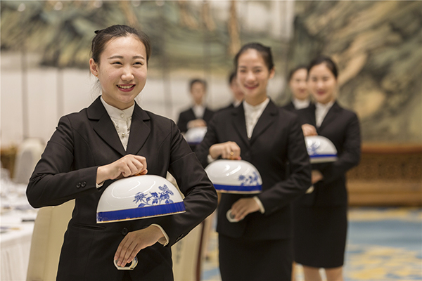 服务演练需要的是各团队的接洽和协调,并不停进行调整与确认。G20峰会会场服务人员专注细节,及时沟通,全面有效接收演练信息,进行会场和其他区域所需物品的准备工作;对各区域进行精心布置,不断调整会场台型、口布折叠、桌面摆设及餐具布置等各项现场工作,如根据要求,元首午宴厅的台布从丝绸材质经过三次替换,选定白色花纹的纯棉材质;为使元首午宴厅桌面摆设更加简约,经过多次的商讨和方案确认,决定将四小碟凉菜撤下,并将黄油盘与面包盘结合;服务工作人员每天经过6 - 8个小时的演练,每日踏出至少1万步的路程,体现了精益求精的细致服务。