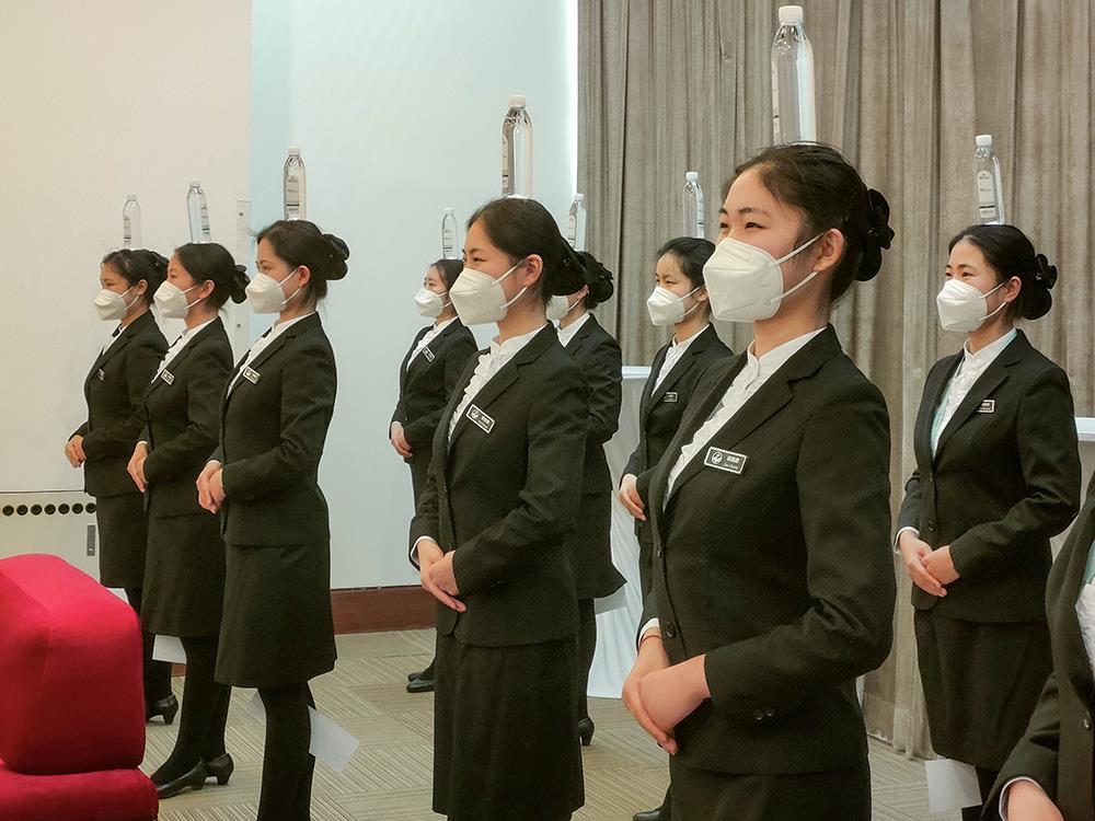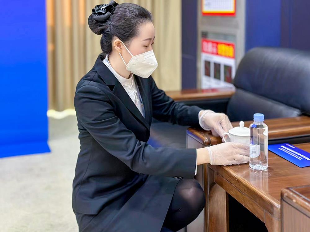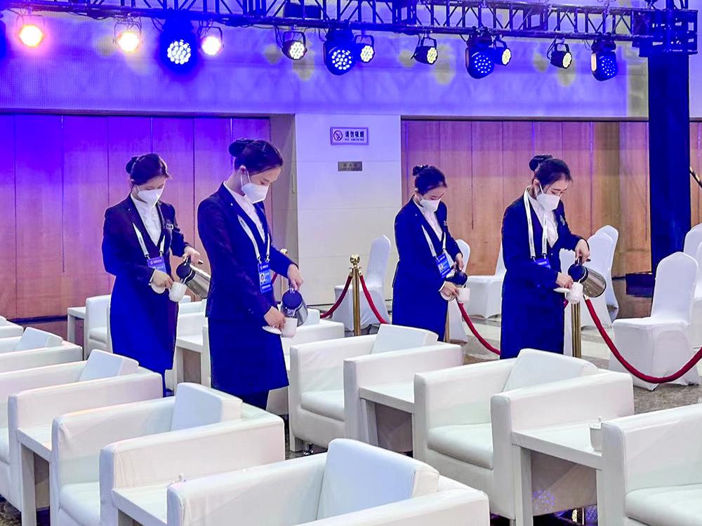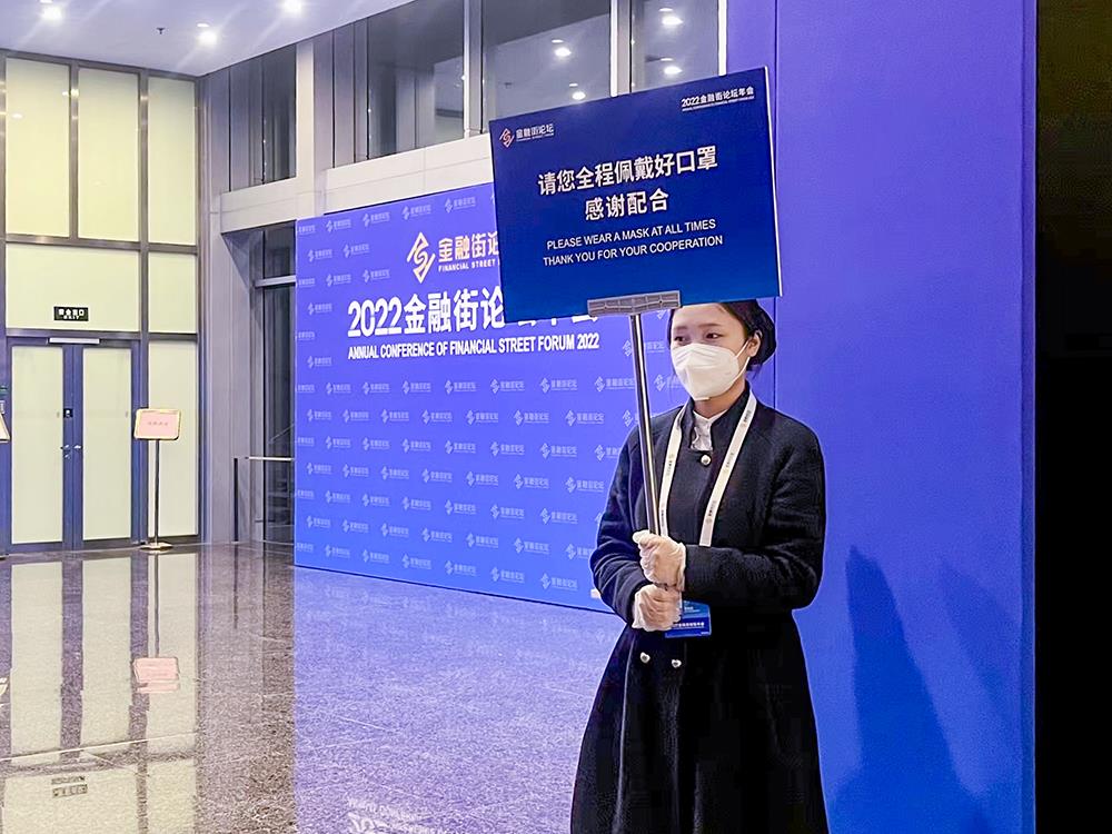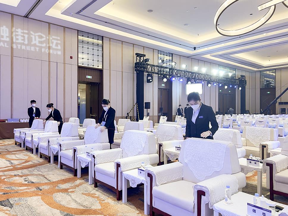金融街论坛自2020年起升格为国家级、国际性专业论坛,被纳入北京市“两区”“三平台”战略部署,成为国家开放发展的重要平台。国家会议中心根据金融街论坛的服务特点,结合以往的保障经验,制定了专属保障方案。服务团队特别针对新场景以与会者视角设计多个场景预演、预练,最终呈现出安全、合理、舒适的服务流程。为了让服务更体现温度,服务团队反复进行礼仪形体训练,即使佩戴口罩依旧可以传递亲切感,让眼睛成为“微笑窗口”;根据演讲者的角度调整讲台上水杯的高低,高度适配,精确分毫,服务筹备细之又细。