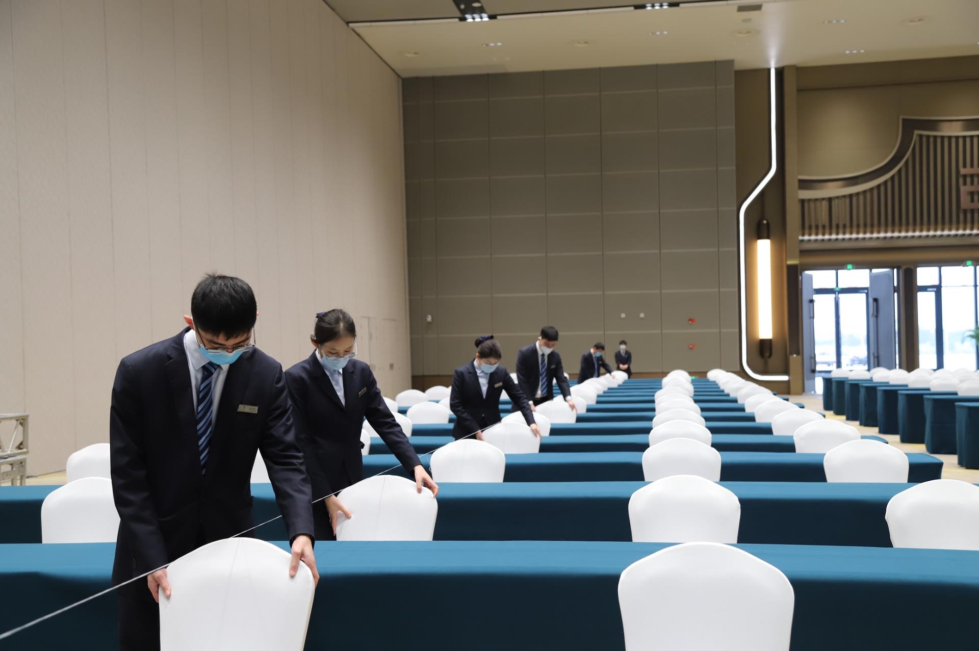 会前,企业全面梳理任务要求,明确部门职责,稳步推进筹备工作,全力以赴保障大会顺利召开。工程团队做好场地搭建以及电梯维保,保障水、电、网络正常运转;安保团队加强安全隐患排查和治理,认真做好施工现场安全和消防管理工作;物业清洁团队对场馆进行全方位无死角的消杀;智能管理中心结合会议场地需求,有序进行灯光设备搭建;餐饮保障团队结合大会餐饮需求,提前制定菜单,调整菜品和茶歇,力求为参会嘉宾带来极致的味蕾体验。
