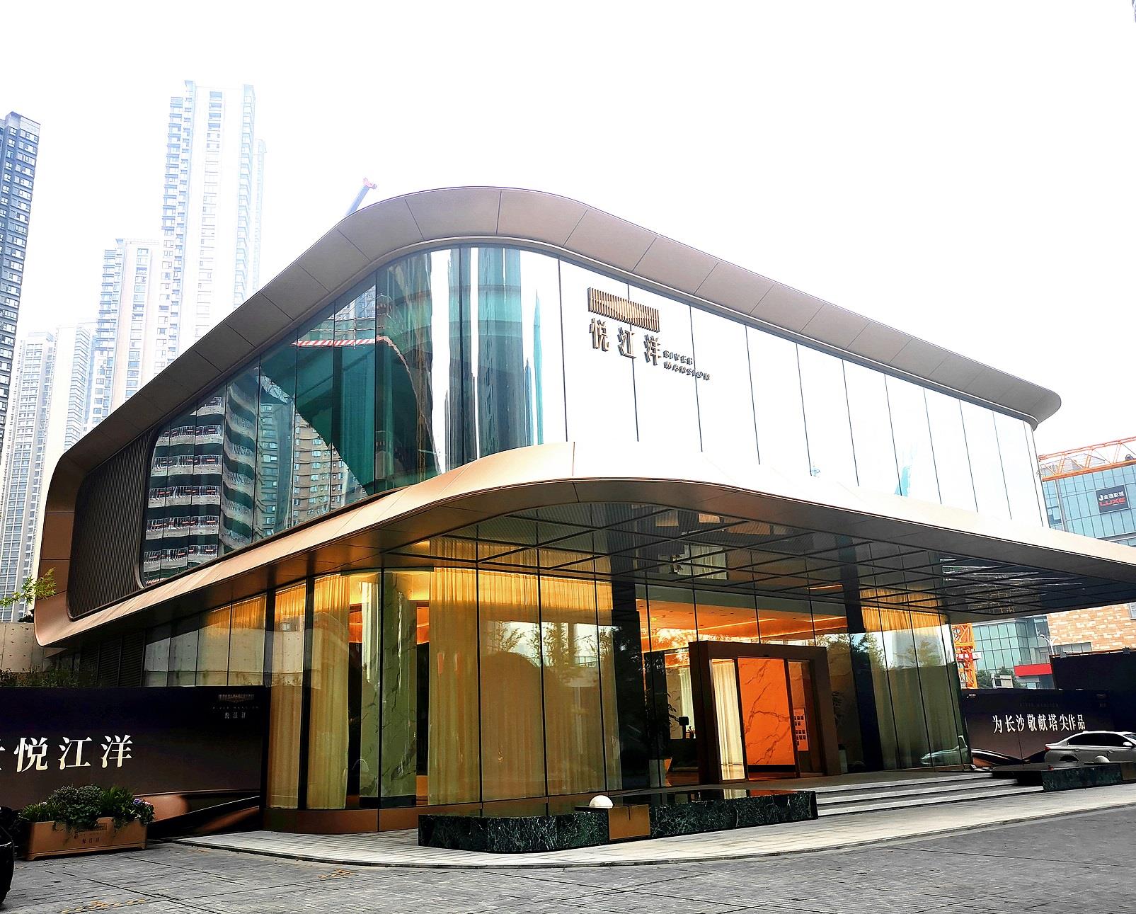 悦江洋项目总用地面积30400平方米,总建筑面积230694.86平方米,由1栋高290米的地标超塔公寓、2栋高200米的天幕大宅和1栋高100米的奢阔住宅围合而成。本次开放的营销中心位于地块北侧,建筑面积1046.82平方米,接待区域室内空间面积约860平方米,分为两层,采用大跨度框架结构,其中,首层高5.8米,作为售楼接待大堂,同时也是社区形象入口;二层高4.5米,前期为销售中心,交付后为物业办公使用。