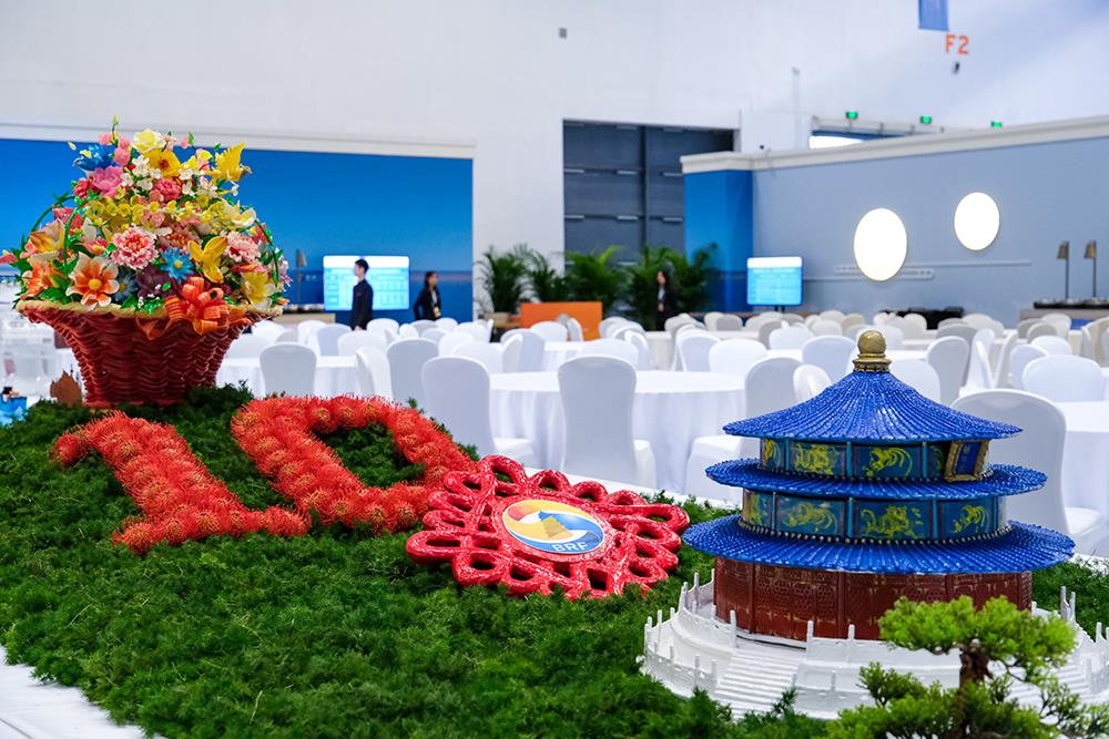 其中,主色为红色的数字“10”造型,在绿色配饰的衬托下,格外亮眼,屡屡吸引客人的目光。制作中,团队反复推敲,最终选定了用象征共同繁荣、万众一心的针垫花来呈现,而密集的花瓣则代表着“一带一路”沿线各国深厚的友谊。