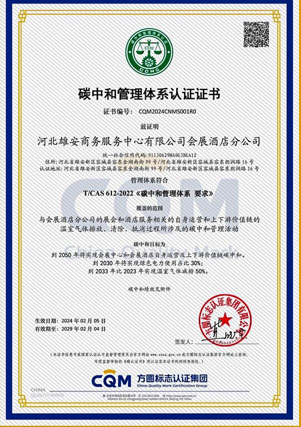 近日,首都会展受托管理的雄安会展中心顺利通过CQM方圆标志认证集团认定,获得“碳中和管理体系”认证证书。该证书是全国首张会展业碳中和管理体系认证证书,是对雄安会展中心在碳减排工作方面取得成绩和做出贡献的肯定。
