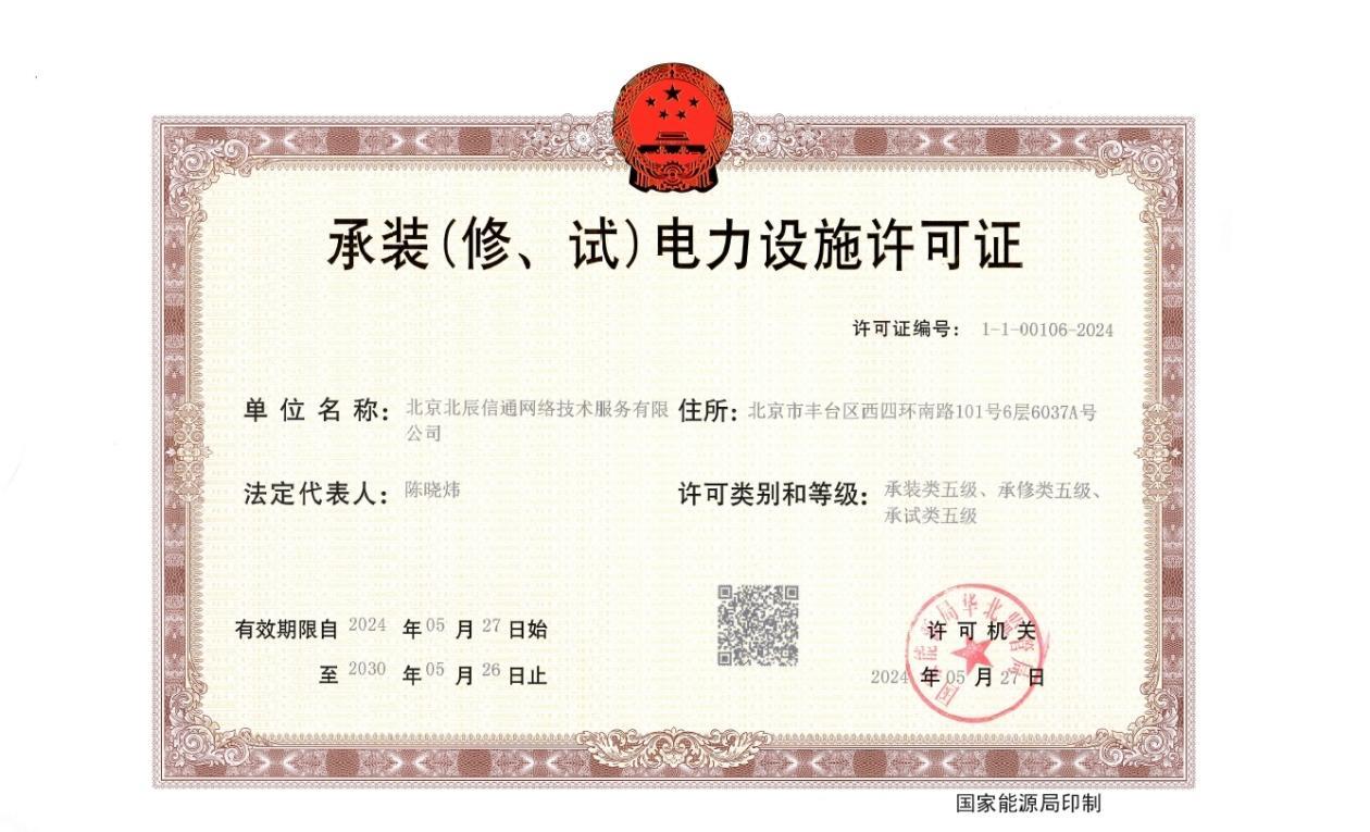 五级承装(修、试)电力设施许可证是国家能源局对企业可从事10千伏及以下电压等级电力设施试验活动的资质证明,标志着企业电力专业水准获行业权威认可,具备10千伏及以下电压等级电力设施的安装、维修和试验的能力。AG凯发商管公设公司将带领信通公司,积极利用这一资质,紧抓发展机遇,提升电力专业技术实力,不断探索新的业务模式和技术路径,助推公司和AG凯发商管高质量发展。