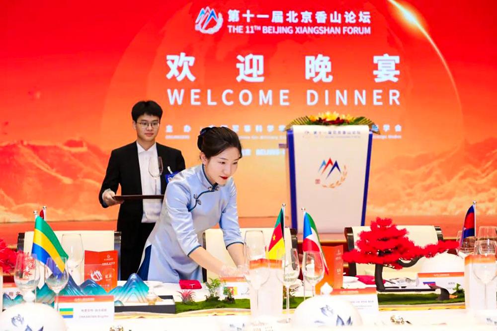 欢迎晚宴现场布置遵守格调高雅的原则,加以素雅大方的台型布置,巧妙融合中国元素,通过色、香、味、器、形,全方位展示中国饮食文化和烹饪技艺。临近中秋,酒店精心制作了月饼和玉兔造型的点心,选用中国传统糕点天鹅酥,寓意中国与各国之间和谐友好。餐具选用青花宴瓷,口布搭配脸谱卡扣,一刀一叉、一碗一盘,在展现美味佳肴的同时,讲述中国故事,以东方的独特之美让世界感知博大精深、源远流长的中华文化。服务现场,身着香山元素旗袍服饰的团队整齐划一、从容自信,成为了一道靓丽的风景线。