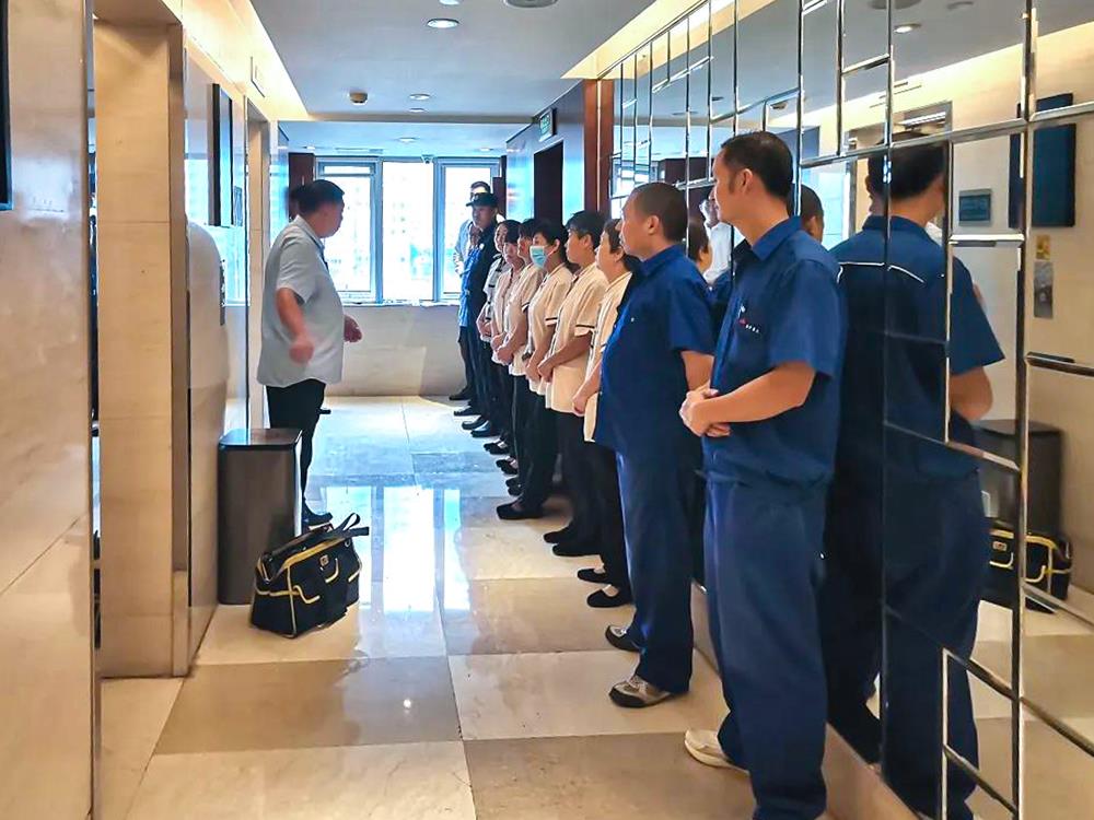 接待前,公寓项目部召开接待部门部署会,结合整体任务,明确工作要求,落实落细各项筹备工作。组织对所有接待用房进行全面清扫,逐间检查设施设备运行情况,确保安全运行;开展电梯困人应急演练、消防应急演练,督促所有员工杜绝麻痹大意思想,筑牢安全防线。
