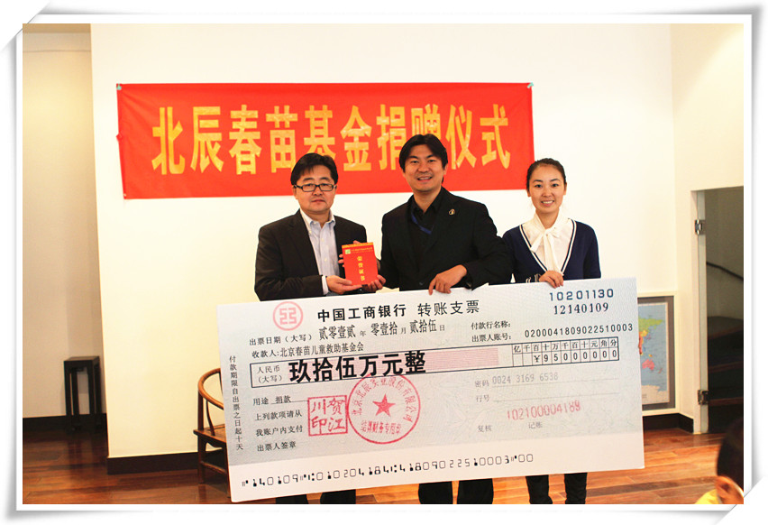 AG凯发春苗基金捐赠现场——AG凯发实业董事会秘书郭川先生(左)、春苗基金理事长刘东先生(中)、春苗基金秘书长崔澜馨女士(右)