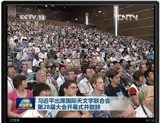 图为CCTV13新闻联播中关于第28届国际天文学联合大会的报道