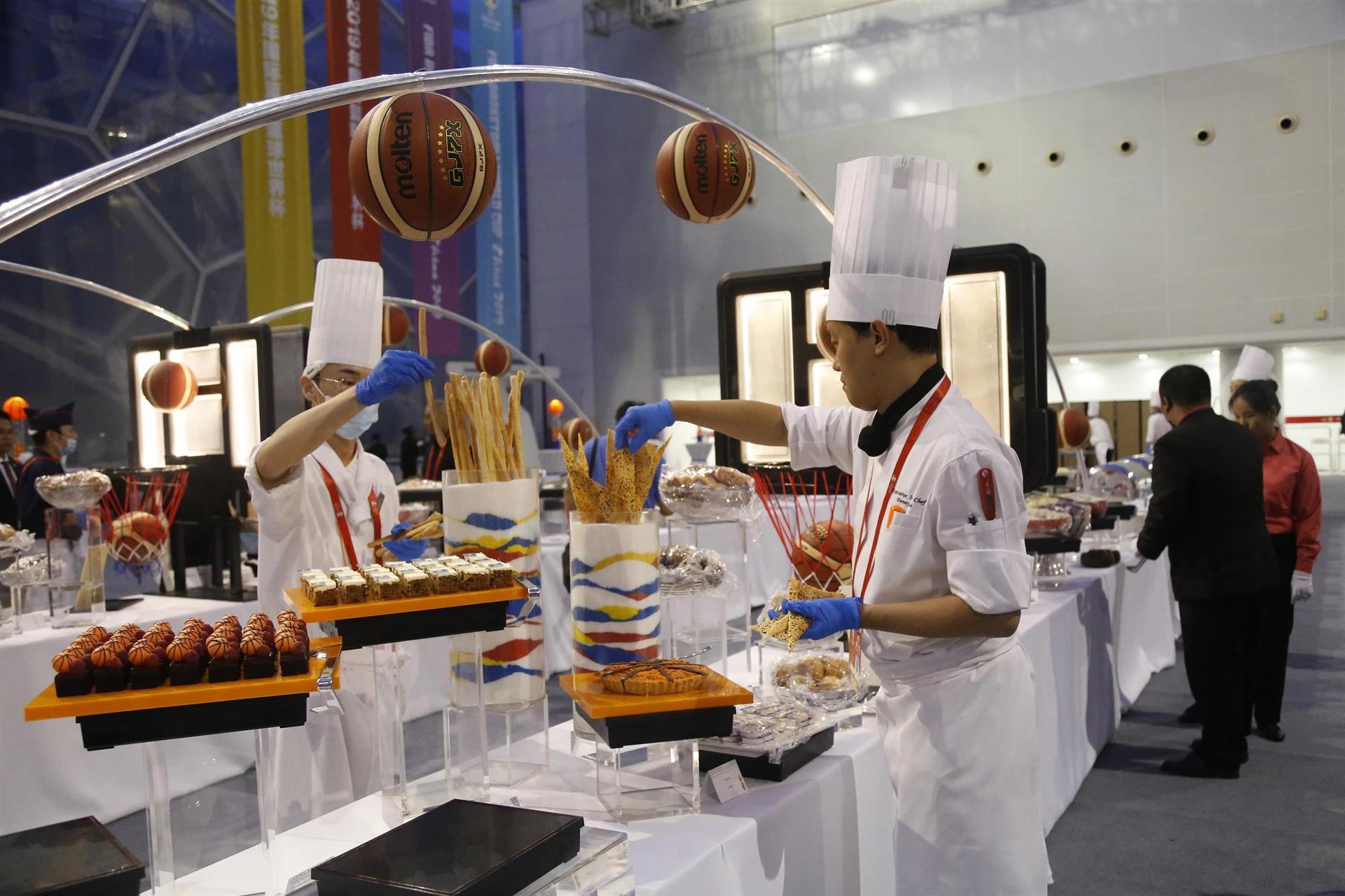 为使晚宴服务更加契合篮球主题,厨师团队深耕细作,先后准备了四套篮球主题装饰方案,利用10天时间制作了近130个仿真篮球糖球和20个1:1的仿真大篮球糖球,用精彩厨艺讲述服务故事。晚宴上,形状逼真、造型各异的篮球造型装饰和篮球茶歇甜点颇受青睐,引来不少客人合影,获得频频点赞。
