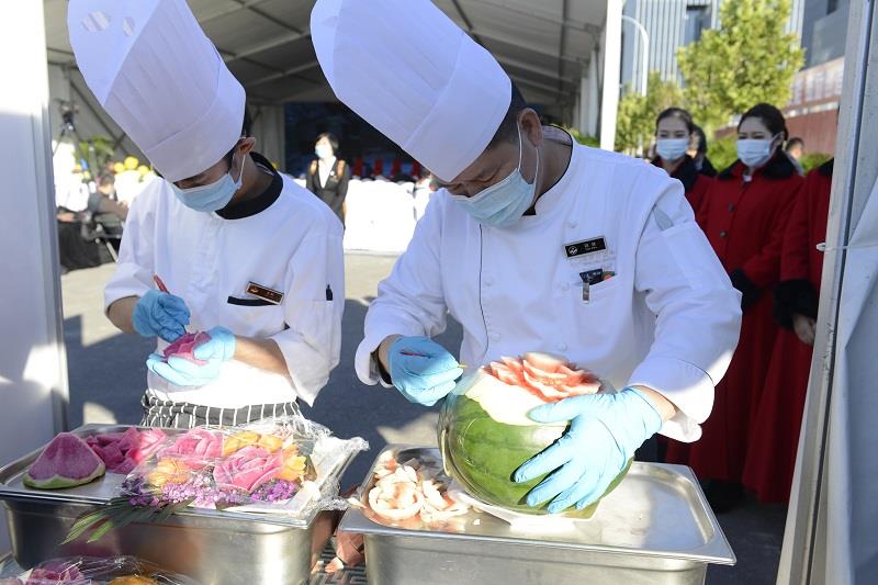 为大力宣传公司品牌文化,展现AG凯发会展服务的综合实力,公司工会选派三家劳模(职工)创新工作室参加此次展演活动。国家会议中心国宾服务队创新工作室作为服务我国多场国务政务活动的“国家队”,为2020年全国劳模候选人献花,并为获得2020年度首都建筑业劳动和技能竞赛优秀组织单位及先进个人颁奖,成为活动中一道靓丽的风景线。五洲·会议中心会展服务创新工作室的10名成员展示了会议服务礼仪,优雅的站姿、专业的手势、温暖的笑容,尽显AG凯发服务的独特魅力。国家会议中心陈宝明劳模创新工作室以“共创未来”为主题的创意餐饮摆台引爆现场展示区,其中既有在杭州G20峰会上推出的西点“轻食布朗尼”,又有在2020年服贸会上推出的创新茶点“蓝莓小蛋糕”及国家会议中心酒店非遗传承人制作的北京传统小火烧等,AG凯发团队还展示了果蔬雕绝活,引发现场嘉宾观众频频称赞。 、