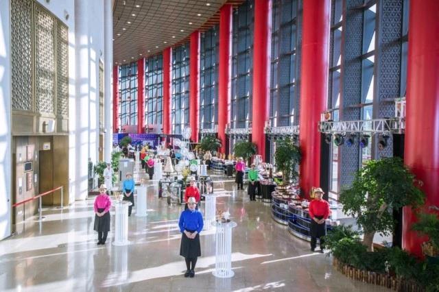 在电影节开、闭幕式最受瞩目的红毯环节,会展中心保障了外围泛光照明近6小时正常运行,热烈的“中国红”灯光让会展中心建筑变身为“星光红馆”,与红毯、明星完美辉映。在最有特色的明星鸡尾酒会上,场馆视野开阔的内环廊和自上而下的落地窗,让嘉宾置身于雁栖湖的青山绿水之间畅聊电影文化,与天坛奖“天人合一”的理念高度契合。同时,会展中心在酒会上提供的中西结合的餐饮,也独具匠心地让美景与美食完美结合。酒会各类餐饮皆引入北影节风车元素,点缀七彩的天坛奖杯装饰、搭配七彩的人员服装造型,使“七彩影印”主题展现得淋漓尽致,而在开幕典礼中使用中国传统纹饰和圆形会场布置大议会厅,更突出了北影节“美美与共”的独特内涵。
