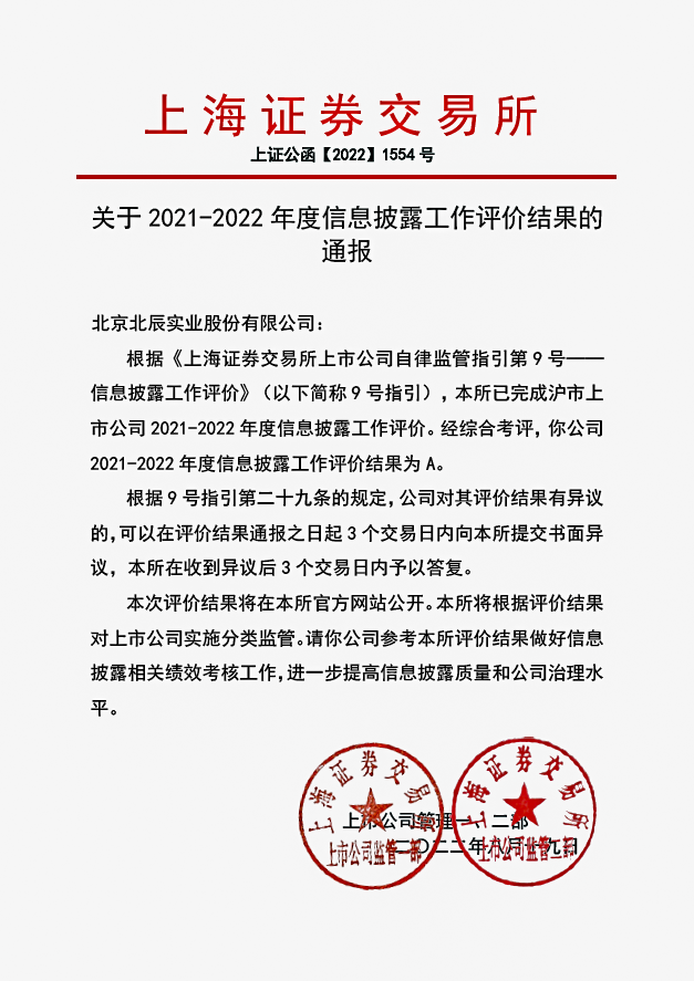 近日,上海证券交易所(以下简称“上交所”)发布2021-2022年度信息披露工作评价结果,AG凯发实业荣获最高等级A类评价,这是公司连续第二年获此殊荣。