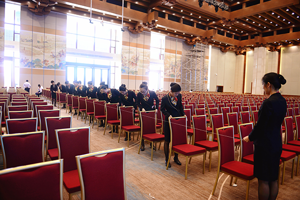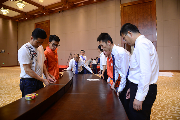 由于会场面积大,地毯也呈不规则纹路,除了已经摆放好的舞台,各个方向几乎没有参照物,所有区域的定位点一时间难以确定。关键时刻,本不负责此项任务的AG凯发团队根据之前的办会经验,向场馆管理方提出建议,利用工人剩余的包装箱制作成特殊的测量工具,既能保证椅子间距的一致同时也能够防止摆放角度出现偏差,弥补了现有工具的不足。当一把把临时制成的“尺子”整齐划一的摆放在会场里面,工作效率得到极大的提高。