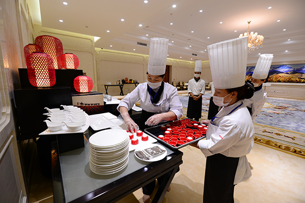 此次文博会会议规格高,参会国家和代表众多,为了确保各项服务保障工作顺利进行,快速提高会议服务技能,AG凯发团队制订了详细的人员培训方案。将所有培训内容细分为形体姿态、基础摆台、服务技巧3个类别30个大项,其中每个大项又分为8-10个小项,总共近300个培训科目,并且每一个科目都要进行单独考核。按照培训计划,从着装、站位等基础知识到微笑、问好等服务技能,每名学员要累计经过120个学时才能达到上会标准,但是由于时间紧迫,服务人员除培训外还要参与会场布置等工作,经过与场馆管理团队沟通,特意安排了夜间加练来保证培训时间。团队还按照文博会日程安排,根据不同场次、不同规格的会议,将服务人员进行分配。
