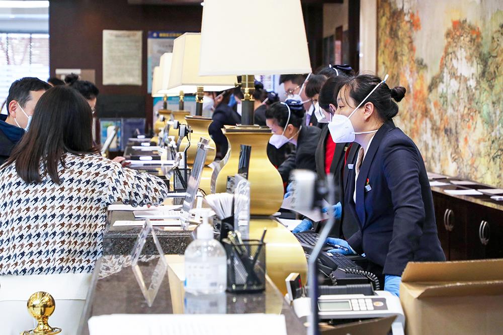 前台则根据入住的具体情况, 提前做好人员安排,确保客人办理入住和扫描证件同步进行,进一步提高入住的速度和效率。同时,安排其他岗位员工积极到酒店大堂支援,协助开展扫码测温登记、入住高峰期指引、运送行李等工作。