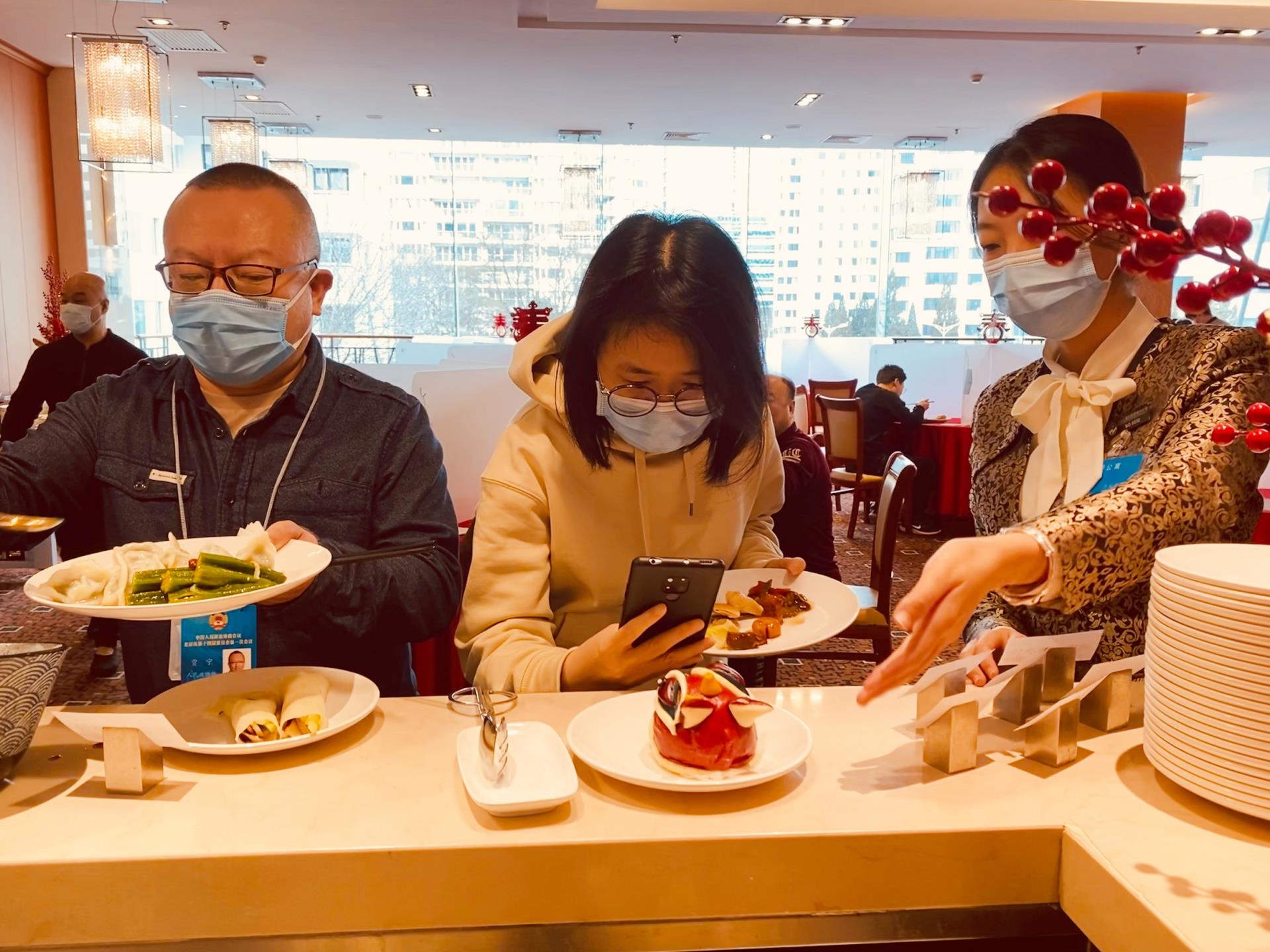 在闭环接待中,企业热情周到,细致严谨,为与会人员提供了全程精细化服务。会议开幕当天正值“小年”,企业提前布置了温馨的环境。委员报到进入大堂后,就能看到红彤彤的中国结。为保障入住环节高效,企业提前与总务组核对,向在店的16个界别小组秘书发放房卡。针对大会出行,企业在大堂、楼层和电梯间安排专人全程引导,提供专业、细致和贴心的服务。餐饮方面,以荤素搭配、营养均衡为主基调,“小年”当天精心准备了自制的老北京糖葫芦、手工水饺,还提前采购了糖瓜等特色餐食;桌椅按照一桌两椅或者一桌三椅的形式摆放,既落实新阶段的防疫举措,又提高舒适性。