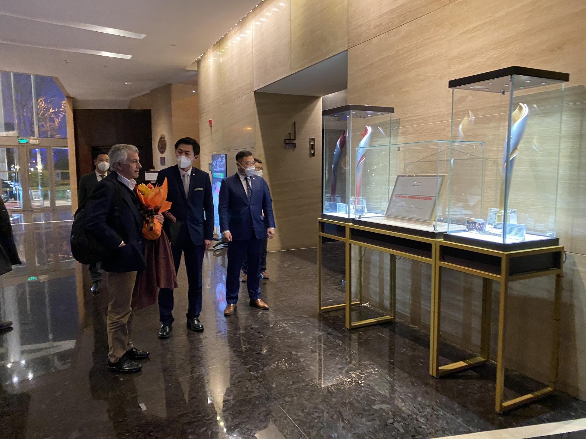 酒店专班对萨马兰奇到店入住工作进行部署,从客房布置、会场安排、欢迎仪式等多方面提前充足准备,确保精益求精、滴水不漏。当萨马兰奇乘坐十余个小时的飞机到店后,他在酒店大堂摆放的巴赫主席和帕森斯主席赠送给酒店业主总经理的两支冬奥和冬残奥火炬前驻足良久。客房内放置的充满冰雪元素的欢迎卡、服务团队与萨马兰奇2022年冬奥期间在店时的合影,处处彰显酒店的用心和真心。