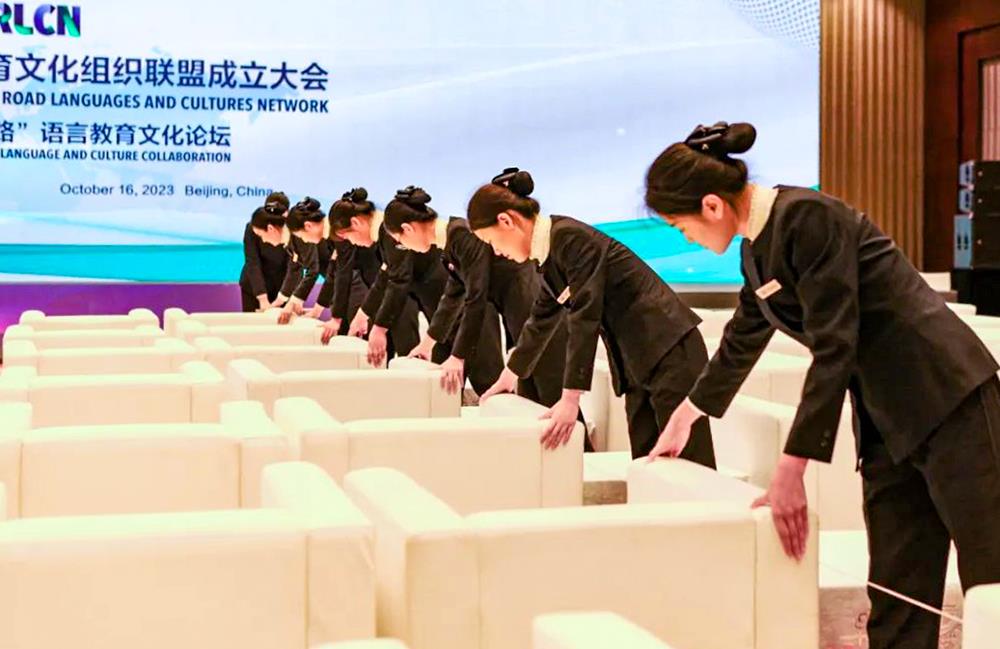 高峰论坛期间,五洲·会议中心承接了“一带一路”系列会议——语言教育文化组织联盟成立大会活动。由于组委会选择自带沙发和茶几,到场时间不明确,因此会场无法提前布置。会议前一晚,接到通知后,二层班组迅速集合、明确分工、按照摆放要求快速布置完会场。随后,班组团队陪同组委会彩排至晚上11点,呈现出最热情、周到、专业的服务,为会议的顺利召开提供了坚实保障。