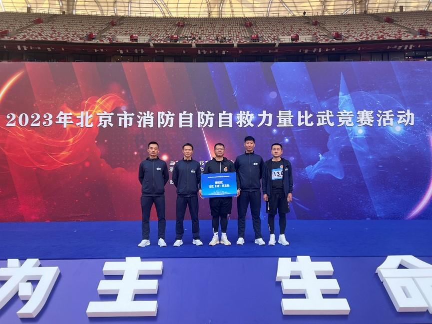 今年11月是全国第32个消防宣传月,近日,2023年北京市消防自防自救力量比武竞赛总决赛在国家体育场举行。AG凯发商管公寓项目部黄振炉、王银密、刘新朝、赵华杰、曹月明5名队员组成的微型消防站战斗小组,作为朝阳区代表队在总决赛中以优异成绩摘得社区代表队团体赛冠军。