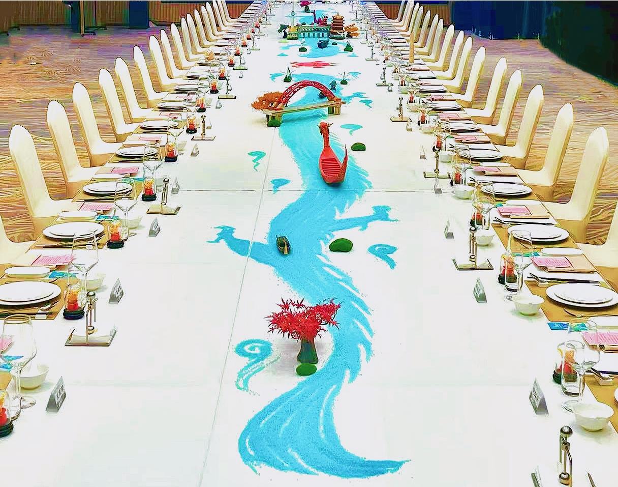 今年,政协武汉市第十四届委员会第三次会议期间,武汉中交五洲皇冠酒店首次作为驻地,接待了7个界别182名委员。会期内,酒店总计接待3400人次用餐、21场会议。酒店以“荆楚韵、江城情”为灵感,倾心打造了独特的摆台设计。服务团队发挥巧思,将大米经过特殊工艺染成深蓝色,精心组合成一幅龙形轮廓的沙画;面点师用面团巧妙地雕塑出长江大桥、黄鹤楼等地标建筑,以及惟妙惟肖的江豚和卡通小龙人。整个摆台设计展现了荆楚文化的深厚底蕴,也传递出了江城武汉的独特风貌。