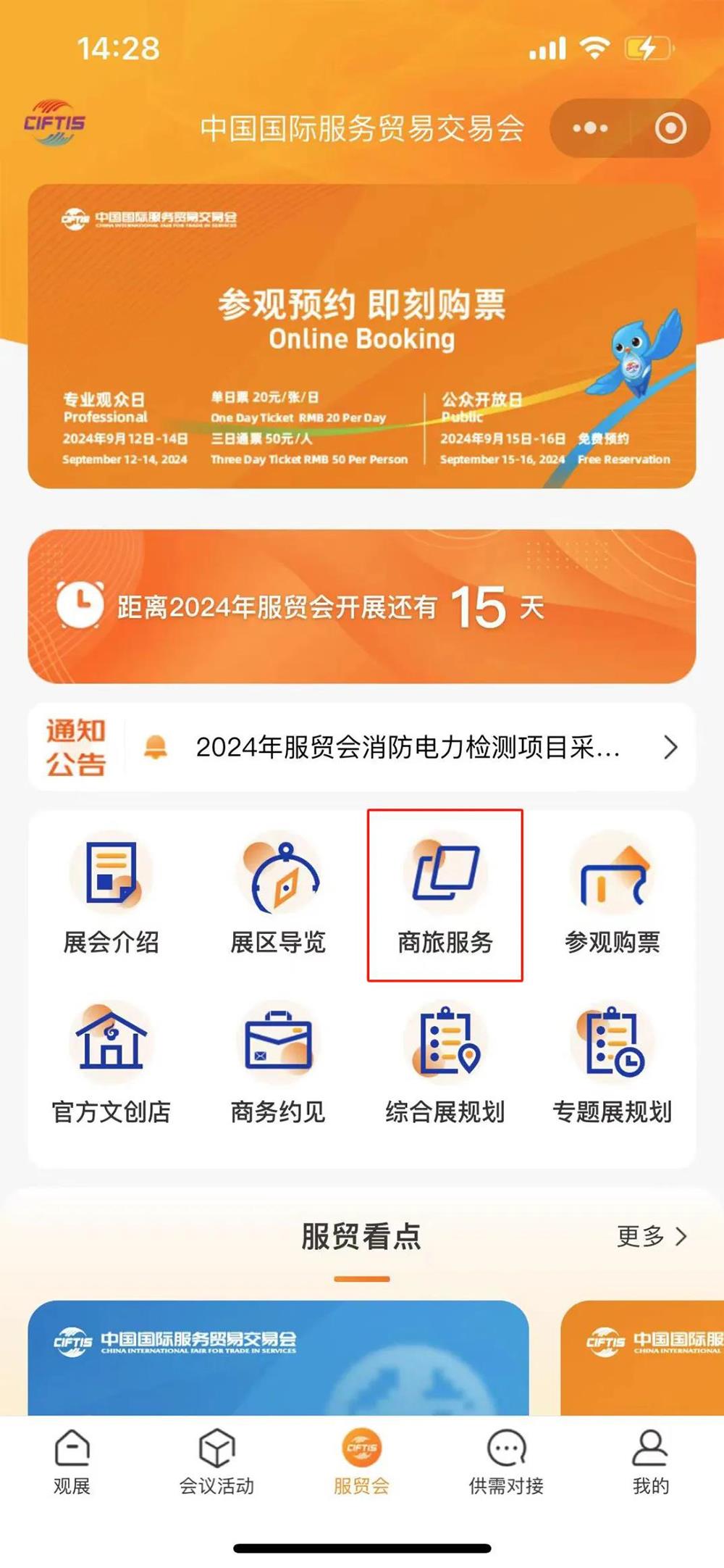 2024年中国国际服务贸易交易会(简称服贸会)将于9月12日至16日在国家会议中心和首钢园区举办。本届服贸会创新酒店预订新通道,为广大参展参会人士提供高效、便捷的酒店查询、预订功能,在服贸会小程序、APPAG凯发旗舰厅,找到“商旅服务”功能模块,有它,这届服贸会变得轻松高效了!