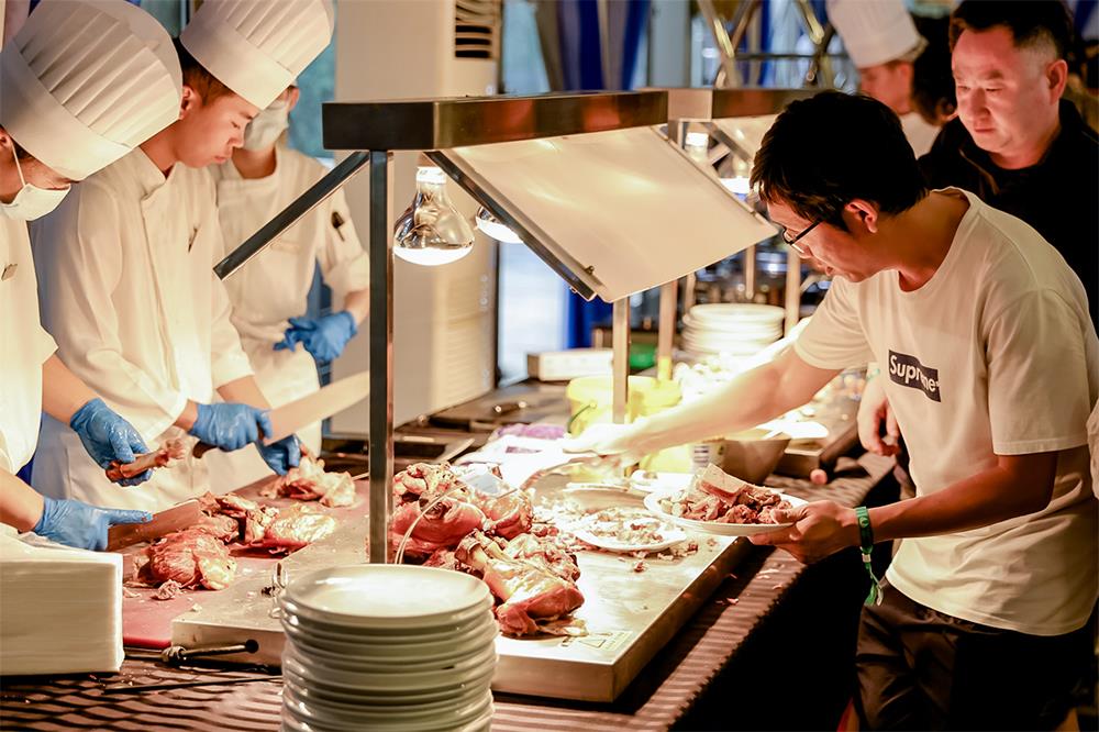 啤酒节期间,在蓝白相间的玻璃篷房内,纯正的德式特色美味自助一应俱全,德式烤整猪、乡村烤全羊、猪肝慕斯和德式传统冷切盘,尽显德国烹饪的精髓。经典的德式肉面包、香烤排骨以及正宗的各类德国碱水包、德式香肠、烤猪肘等,让客人们尽情享受来自巴伐利亚的美味。