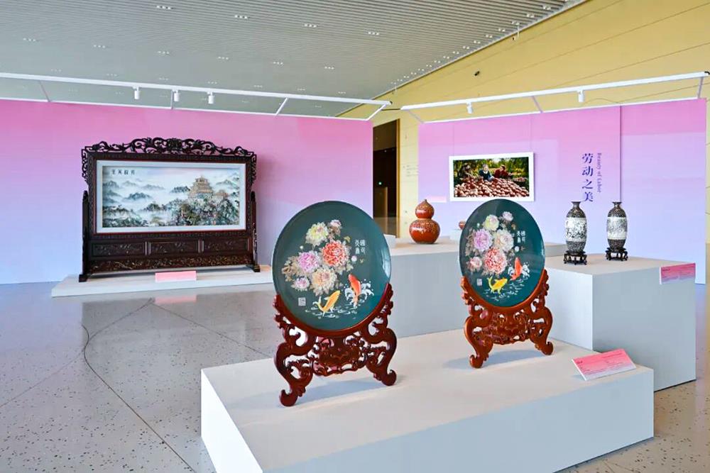 在三层东序厅,由全国妇女联合发展部主办的“华韵承芳·非遗共赏”非遗作品展成为会场亮点。展览设置“传统之美”“和合之美”“劳动之美”“女性之美”四大展区,通过刺绣、剪纸、制瓷等传统非遗技艺,讲述中国女性在文化传承与创新中的动人故事。